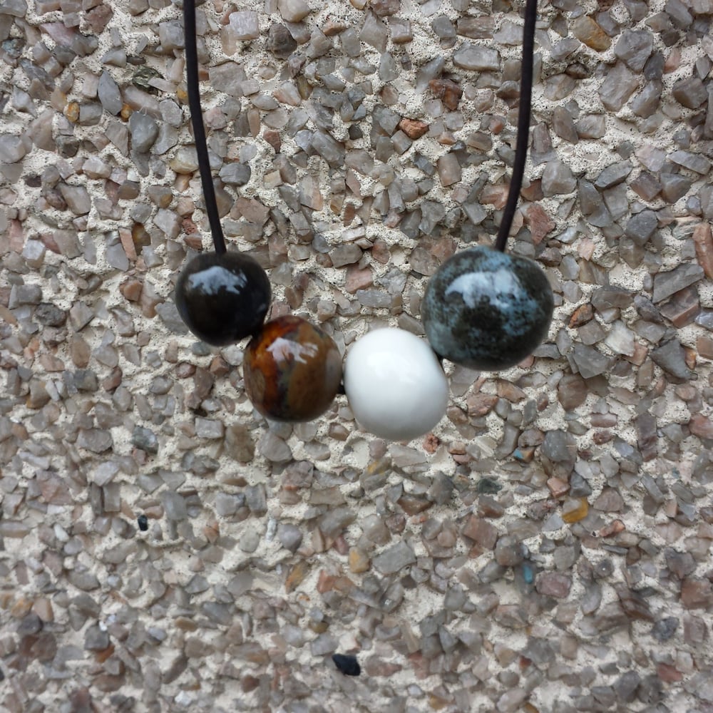 Four hand built stoneware beads, painted with glossy black white and two special variegated glazes; this necklace hangs about 30" long on a dark brown, round leather cord and is closed with a piece of round brass (nickel free). Pull over your head and go!